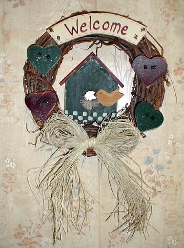 These come in different color combos and have different sayings on the birdhouse. Pick two colors from list and specify the color for the large heart. Choose from Hunter Green, Burgandy, Navy, Country Blue, and Mauve. Also pick if you want it to say " Home Tweet Home" or "Welcome" or "Bless this Nest".