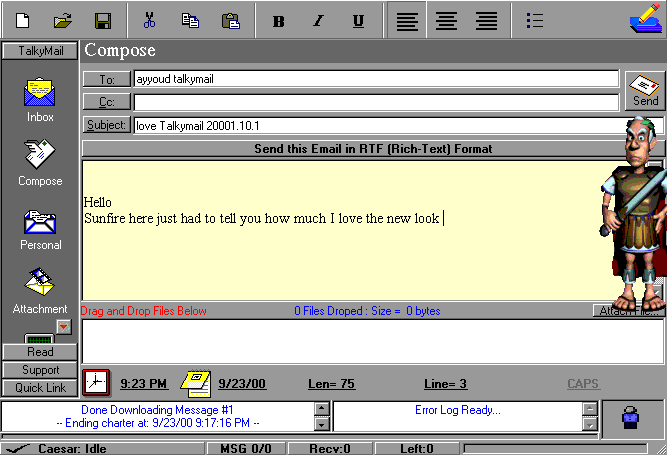 I tried this program when I found it and put it on my main web page.I have now had the chance to use it for a while now and wanted to be able to tell you how easy and the many things you can do with TalkyMail.I have taken some screen shots to show you just how easy it is to set up and use. This first screen shot is the page to send your emails,you can make your background on your sent mail,your recieved mail and your personal file any color you choose and change the color with ease.