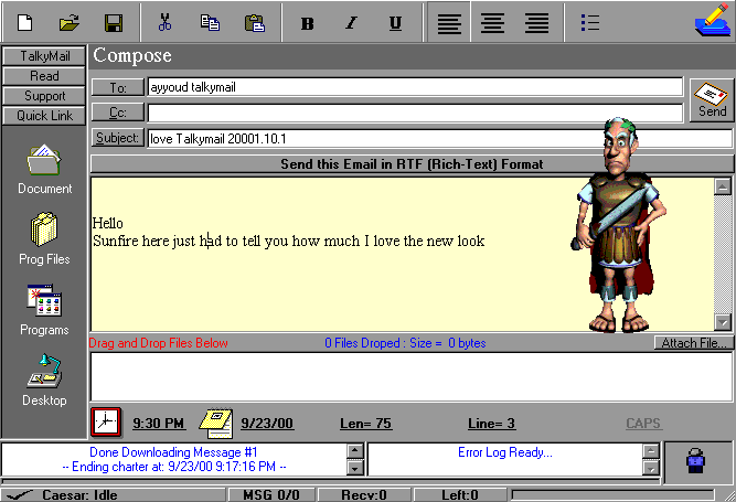 Want to find a file in your documents? go to your programs?your desktop? its easy with the quick link buttons on the left of talky mail as shown here.