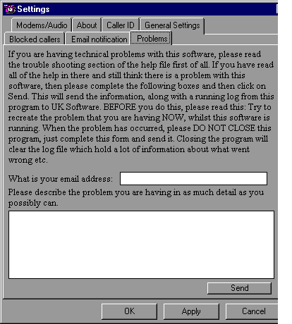 This screen shows your modem setting and incomming lines and the system used to hear the messages.