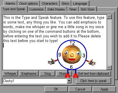 This brings me to The Type and Speak feature, here what ever you type in the box the selected character speaks....Now talking to the programmer of this software he gave me a great idea .....use this to record your answering machine messages....if your like me I hate to call home and hear ME!!!...on the answering machine *S*