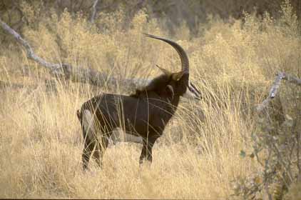 PHYSICAL DESCRIPTION: Lengh is approximately 9 feet with a shoulder height of approximately 4 feet. Weight is approximately 400 pounds with males larger than females. Backward curving ringed horns grow throughout life and range from 20 to 40 inches on both males and females. Color of males coat is dark brown to black with white beneath; females and young have russet coats fading to pale beneath. HABITAT: Moist grassland and open woodland from southeast Kenya to Angola and eastern South Africa. |