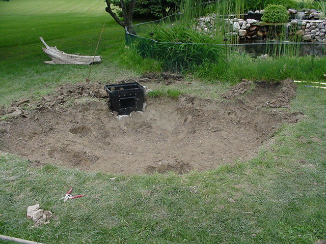 At the south end of the main pond there was a 7 foot young maple tree. Our concern was that it would grow to completely shade the pond. After the tree was relocated, there was an 18" deep hole. The pond addition was centered around that hole.