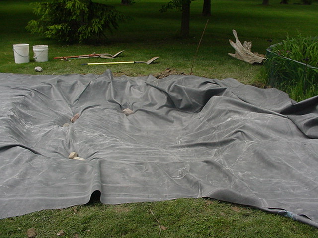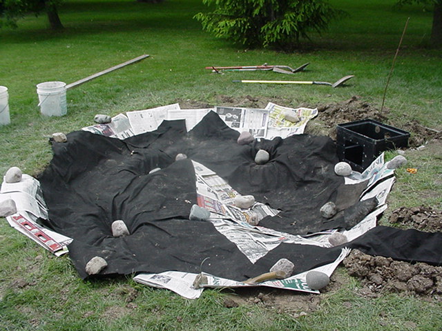 To prevent hard objects from poking holes in the liner, the hole is lined with padding. We used pieces of Geo-textile underlayment left from the main pond construction the previous year. The gaps were filled with multiple layers of newspaper. Carpet remnants can also be used.