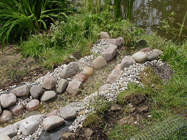 Waterlilies, aerating water plants (Myriophyllum) and dwarf cattails were planted. The roots were dug into the trenches and covered with gravel. Duckweed and water hyacinth floated down the stream and took up residence in the new pond.