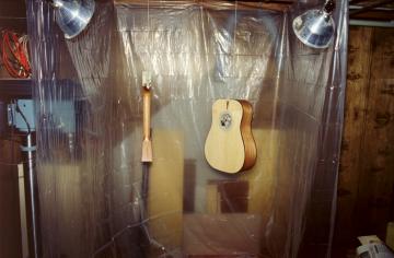first coat! Lacquer itself is interesting, because the fumes are not only toxic but highly explosive. Wearing a good quality mask with organic vapor filters is important, and making sure that there are no flames or sparks nearby is equally important. Because I started the finishing process in January, and I live in New Hampshire, our gas-fired boiler and gas-fired hot water heater both run frequently, and are located (of course) in the basement where I needed to do my spraying! So, for over a week I had a routine of turning the heat up very high when getting up in the morning, and then before leaving for work, shutting down the furnace and hot water heater, and extinguishing the pilot lights. I'd spray a coat of lacquer on, and then head to work. I'd come back two hours later to re-light the hot water heater and furnace, and warm the house back up. Then, I'd do it all over again after another 2-3 hours had passed. After every two to three coats, I'd sand with 600 grit paper to try and even out the finish. The finish did not come out as smooth as I had hoped, but I attribute that to spraying the lacquer in a 55 degree basement instead of the recommended 70 degrees. In this picture, you see a make-shift "spraying booth". Basically, I bought a cheap plastic tarp, and made a three-sided area out of the plastic to catch the overspray. I put a screw eye in the neck-joint area of both the body and neck to use for suspending the part while spraying.