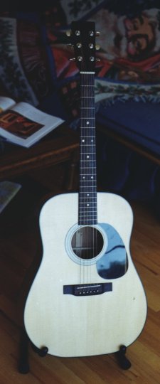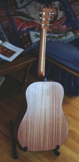 I do intend on making another guitar. After I take a break from it for a little while and get some other projects done, I'll decide on whether to do another kit, or to go for broke and try making a guitar completely from scratch. I've picked up a bending iron to practice bending sides; I may just buy some quarter sawn cherry and practice making necks and sides, and when I get a set of sides and a neck that seems pretty good, I'll stop practicing and build the rest of it! :-) Until then, I'm just going to enjoying playing an instrument that I actually assembled myself! And as you can see for yourself from the picture below, the guitar also meets with Bengal's approval.