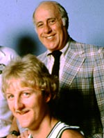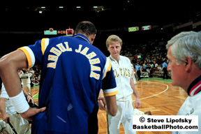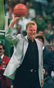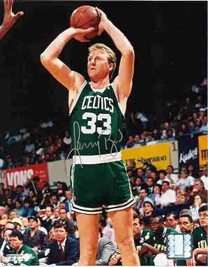 Larry Bird was a 6'9 SMALL FORWARD from the small town of French Lick, Indiana. "The Hick from French Lick." Larry attended Indiana State University, after withdrawing from Indiana University. In college he averaged 31.3 points. After college he went on and played for the Boston Celtics. He played 13 years for the Celtics. Bird always hustled, was fairly consistent, and excelled in most areas of play. He scored, a passed, a rebounded, a defended, was a team player, and could be counted upon when the game was on the line. Brid sometimes practiced three-pointers with his eyes closed. Not too many players have played harder than Bird.