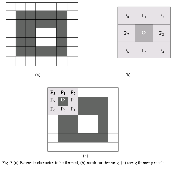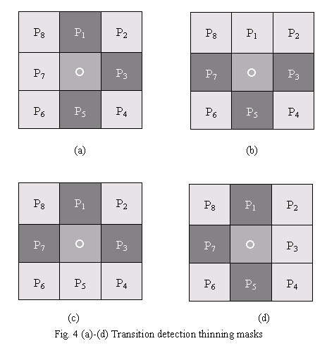 Figure 3(a) shows an input image on which the thinning algorithm is to be applied. Each box represents a pixel. Figure 3(b) shows a 3x3 mask that is used to move over the input image during the first pass and then on the intermediate image during the second pass. The center of the mask is positioned on the pixel of interest during the scanning process and the numbered boxes represent the corresponding neighbor pixels. The pixel of interest, shown as “o”, is marked for deletion when all the following conditions are satisfied. These conditions are checked only for a “dark pixel”.