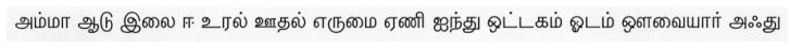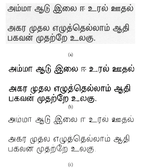 Figure 1 shows the unique characters that can be printed using the InaimathiTSC font family, at 12 points size. This font follows the Tamil Standard Code for Information Interchange (TSCII) [4] encoding. For our analysis, we scanned the documents at 150dpi (dots per inch). Given the nature of this project, we decided to have a short scope and hence kept our analysis simple. Therefore, we concentrated on recognizing only 31 characters (12 vowels - from the first row, 18 alphabets - from the third line in fig. 1 and a full-stop character).
