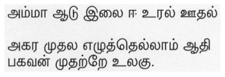Tamil is a classical South Indian language spoken in India, Sri Lanka, Singapore, Malaysia. The language has 31 basic alphabets (12 vowels, 18 consonants and a special consonant) and the written script is comprised of 247 characters.