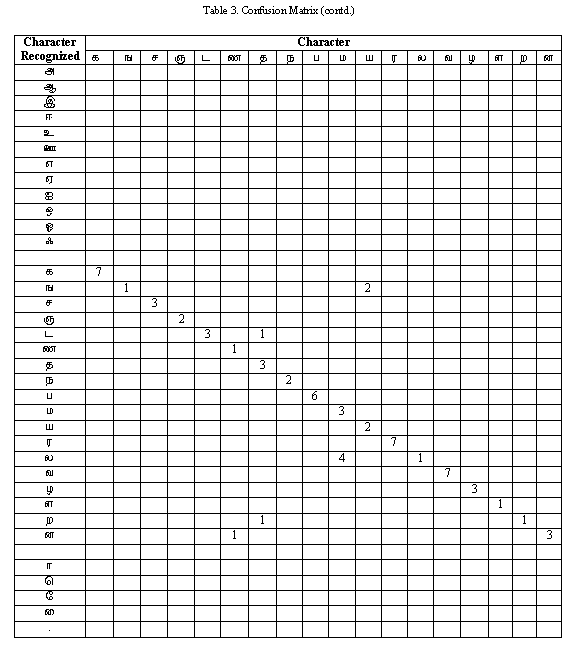 A simple character recognition application was successfully developed for Tamil characters and was found to perform reasonably well with sufficient accuracy (results are shown in tables 2 and 3). This is our preliminary study of character recognition systems and we plan to continue our work in future. We hope a more complete OCR will evolve in public domain with this work as the starting point, so that our primary source of motivation will benefit from our efforts.