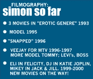 Simon is a very good artist. I don't think anyone mentions that. Carrer: A model for such brands as Tommy Hilfiger, Levi’s, and Boss. His girlfriend, who was a model brought him up to the studio, and thats the way he became a model! He has been an mtv-vj and a Disney-guy for the teen section. He was fired from Disney because of his past, then moved on into acting…He’s starred in a independant movie called ”Snapped”, where he plays a role as himself. He just finnished his role in the movie "I know what you screamed last summer". Unfortunately, this movie will not air in theatres, it was too similar to the more popular "Scary Movie". Now he's in the recording of movie "Forsaken" coming to a theatre near you in the beginning of next year. Simon has also made appearances in some tv-shows (like ya didunt know) - Felicity, Katie Joplin and Jack & Jill where he plays Mikey....there are some pictures of him in some scenes in the album. Funny