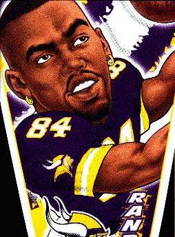 This full sized, Officially licensed NFL Pennant features Moss' image, catching a football. Below his image is a Vikings logo, and the name: "RANDY MOSS" in bold, block letters. Entire pennant is too large to scan (Pennant Dimensions: 1' x 2 1/2'), so the photo above just shows about half of it. The Pennant is in Ultra-MINT condition! Still has the cardboard merchant tag attached to it. (The 3"x5" peice of cardboard that a store would use to hang it on a rack).