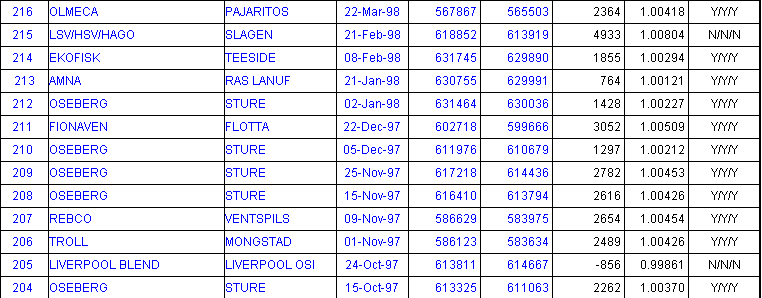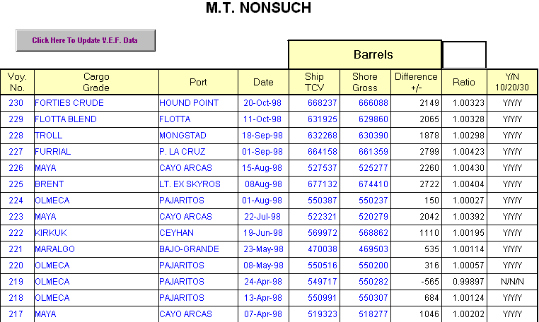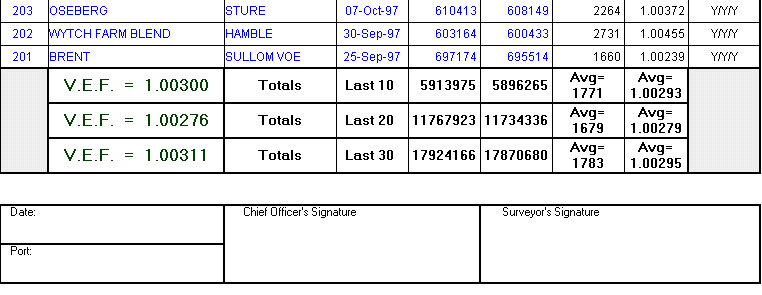 On completion of paper-work after loading, the Chief Officer can open this page of the workbook and click on the button to automatically update the sheet with the latest data. A print of this report can be presented to the next load port independent surveyor. VEF data presented in this format would be greatly appreciated.