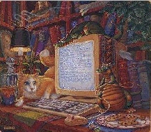 These two pictures, I found while surfing the net. The Cat and Computer is by Randall Spangler. Garfield is by Jim Davis. But they both combine my two favorite things. Cats and Dragons!! >And if you happen to wonder about the background. This is a photo of me. When I was about 2 1/2 or 3, with my first cat, Cat!! I know, I know original name huh? I seem to have a preference for orange tabbies. Both in real life, and in artwork! *g*