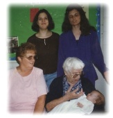 This picture was taken on August 18, 1996. The day we had my 1st granddaughter baptised. In the back is Crystal Lorraine Hood (mother), Linda Lou (Householder) Corman (grandmother). Sitted is Charlene (Brown) Householder (great-grandmother), Margaret (Lavinski) Brown (great-great-grandmother), and Brittany LeeAnn Hood. Margaret Brown came from Scotland in 1926, so Brittany is one of the 4th generation to be born in this Country. On January 22, 2000 Margaret (Lavinski) Brown, passed away peacefully, exactly 2 months shy of her 93rd birthday. |