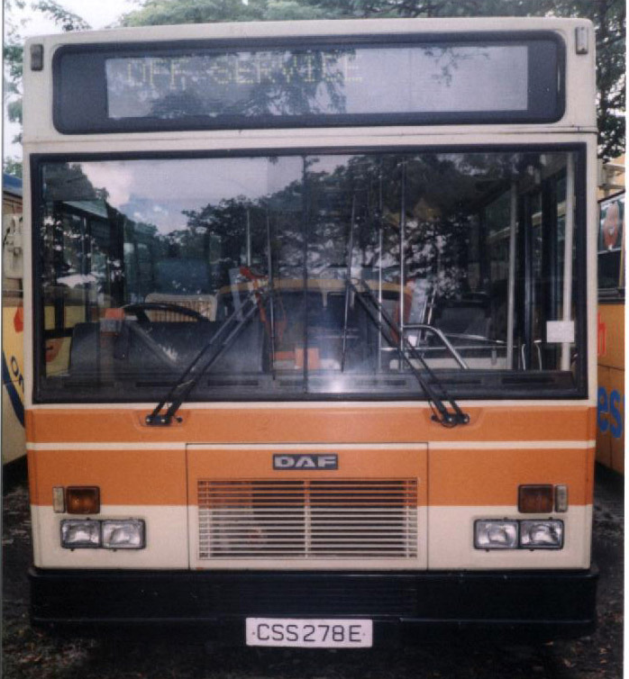 Since its founding in 1983, Trans Island Bus Service (TIBS; now known as SMRTBus) had been using Japanese buses from either Hino or Nissan Diesel. In 1990, TIBS introduced its first European bus model, the DAF SB220LT. The chassis were made in the Netherlands and they were then shipped to Zaragoza, Spain to be built with a bodywork by Hispano Carocera. The buses arrive in Singapore as Completely Built Up units. They were the first to be fitted with an Electronic Destination Sign (EDS) which indicate the service number and destinations. The Hispano bodied SB220LT were first deployed on TIBS's new semi-express routes; 950, 951 and 952 which connected Woodlands New Town with Shenton Way, Boon Lay and Marina Centre respectively. In 1996, TIBS bought another 50 chassis which had a Walter Alexander Setanta bodywork built in Falkirk, UK. The Hispano DAFs were transferred to Singapore Shuttle Bus (a subsidiary of TIBS) as a replacement for the old buses which were withdrawn in 1998-99. Since then, they bear CSS registration and deployed on City Shuttle Service routes. |