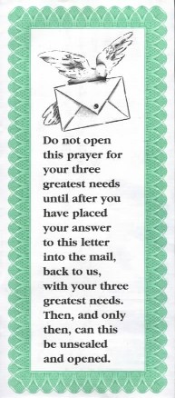 Here it is. This contains the answers. It must. I'm not supposed to open it until I send out the Prayer Page. I still need to do that. Only then can I open the mystery envelope. But do I really want to? Am I prepared for the knowledge contained therein? Maybe it was meant for someone else, and if it falls into the wrong hands (i.e. mine), it could be disastrous. I'm at a loss. I guess we'll have to wait and see.