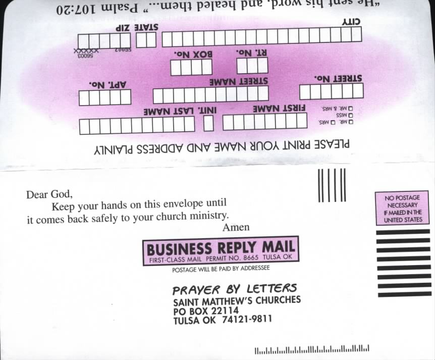 Looks like God loves me unconditionally, but he'll only belss me if I send money to strangers in Oklahoma. What could possibly go wrong?