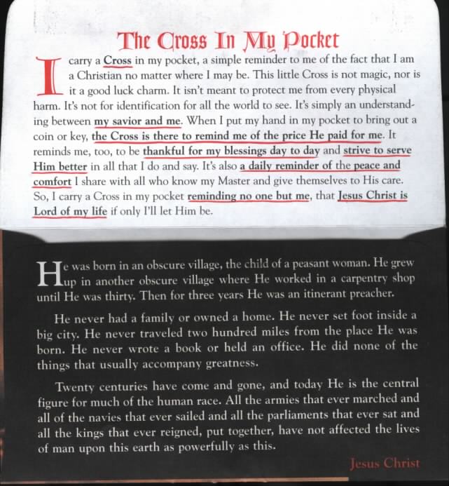 The inside of the envelope is divided into two parts. The first informs us how we're to use the cross (keep in pocket as daily reminder), and it has a disclaimer saying it doesn't actually do anything.