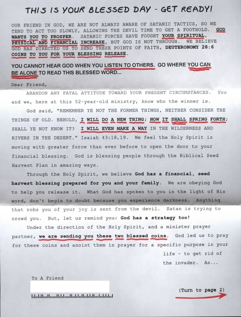 Evidently, Satan is trying to keep me from gaining material wealth. Lucky for my, I have this letter and two blessed coins. Woohoo! I'm already gettin money! This is pretty exciting news. Let's go on to page 2.