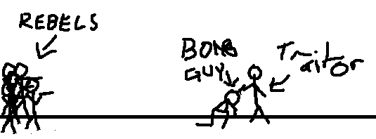 Meanwhile, the rebels are making their way back, and they had some bombs placed on a bridge so they could blow it up once across. Once they cross, they decide to wait for Hardin, as one would expect. In the meantime, one of the rebels starts to hook up the explosives to the detonator. You'd think they'd have done this earlier when, you know, they weren't so rushed. Once it's hooked up, the traitor shows up and points a gun at the guy with the detonator remote. Here's a diagram of the situation: