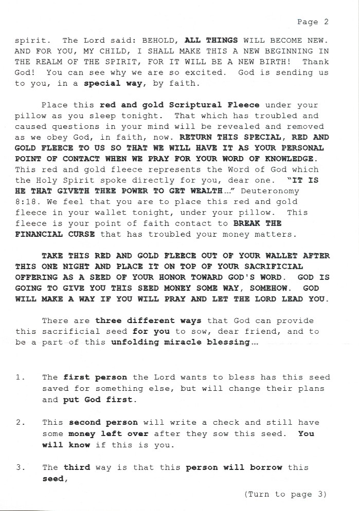 So, I need to sleep with the fleece, put it in my wallet, and send it and my money back to them, if I want to break the curse. There's also three ways God can provide for me, or something. To be honest, this entire letter seems pointlessly vague. I just don't follow, but they say it's important, so I might as well. So, what are the three ways?