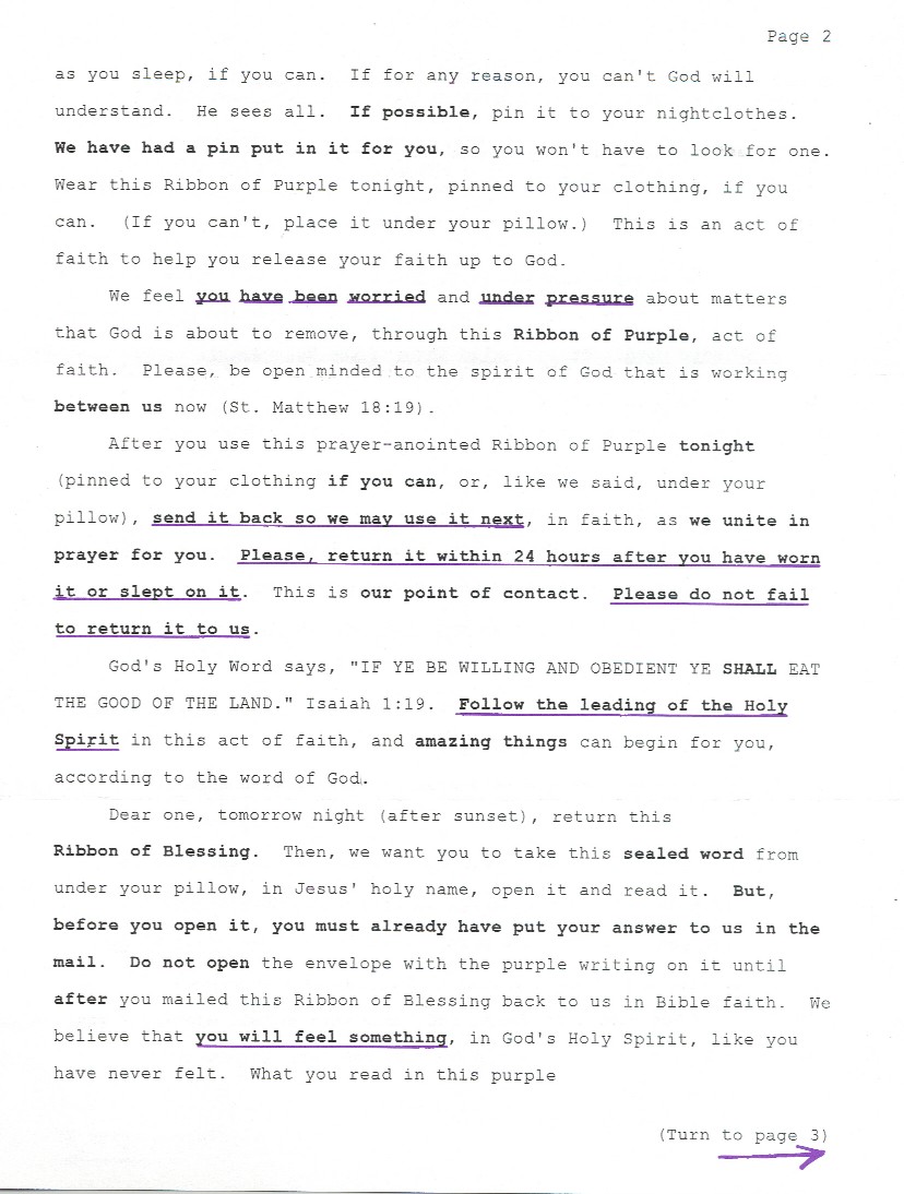 I send back the Purple Ribbon of Blessing Church Act of Faith Bible International and open the magic letter. What I read will make me feel something special.