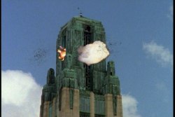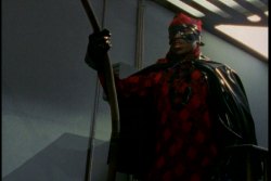 He's evil. He's also pretty stupid, because the Black Scorpion (with the help of her friend Argyle, donning his argyle-patterned costume for the only time as Captain Argyle) dupes him into thinking she's on live TV, when actually it was pre-recorded, and she's really there to kick his ass. She and Argyle quickly take care of him and blow up his giant laser in a tremendous special effects scene before he can blind the city. |