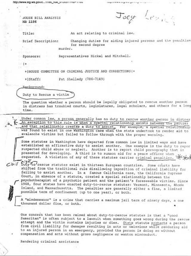 Duff Wilson of the Seattle Times posed a similar question in regard to Medical Research Abuse and "uninformed consent" (46). And Janet Wells of the San Francisco Chronicle has written about "Bad Doctors Going Unpunished" (45) and that "Hospital Fail to Report Bad MD's, Experts Say" (54). These factors (combined) constitute "Unfair and Deceptive" business practices. And other criminal law violations, such as a "Failure in a Duty to Rescue (57) and Rendering Criminal Assistance(33).