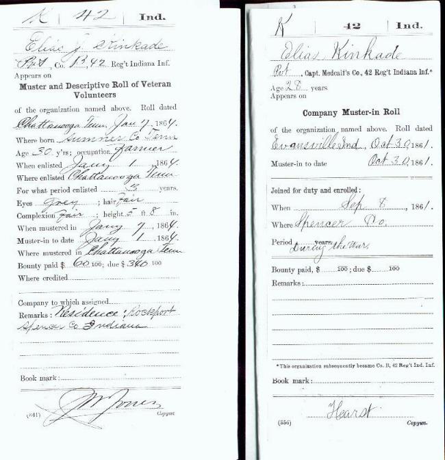 Enlistement Spencer Co Ind Oct 30 1861,Reenlisted Jan 7 1864 Chatanooga TN.