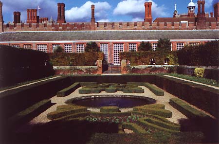 ![]() Part of the rear facade of the palace with gardens. Once Hampton Court became property of the king, it was necessary to extend the building to accommodate the Tudor court, numbering around 1000. It became the favored country palace of Henry VIII and five of his six wives lived there as well. Anne Boleyn's gateway between the Base and Clock Court recalls his second wife. It remained a royal residence (Oliver Cromwell even retained the property for his own use) until the 1760 death of King George II and underwent many structural changes during this time. The most notable improvements to the palace began in 1689, shortly after the ascension to the throne of William III and Mary. With Louis XIV's Palace in Versailles as inspiration, architect Christopher Wren was instructed to begin work on the conversion of the Tudor Palace. Wren's severe Baroque design incorporated the use of red brick and white stone accents with exquisite masonry throughout. Brick was used, but richly embellished with Portland stone for the arcades, windows, friezes and parapets. The new structure was located to the south east of the original palace and was completed in 1700.
