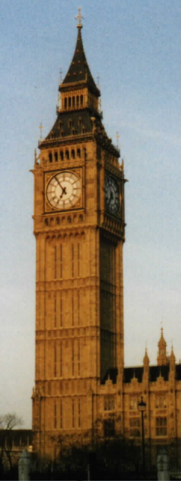 Big Ben, the hour bell of the present clock tower of the Houses of Parliament, was installed in 1858. It was named after the First Commissioner of Works at the time, Sir Benjamin Hall. The bell weighs over 13 tons and the clock mechanism alone weighs about 5 tons. The figures on the clock face are approximately 2 feet long, the minute spaces are 1 square foot and the copper minute hands are 14 feet long. The tower stands 320 feet high. A light above Big Ben signals that Parliament is in session.