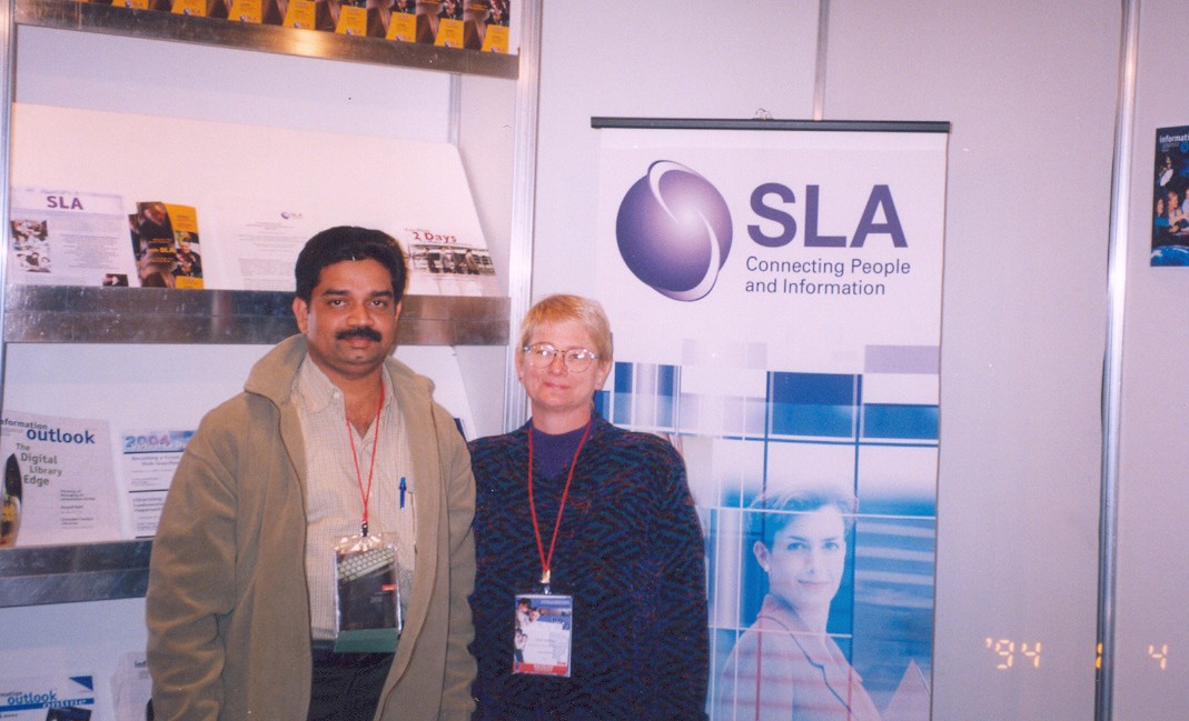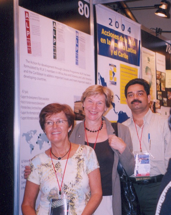 Salonen at SLA stand during IFLA General Conference 2004 held in Buenos Aires, Argentina during August 2004 |