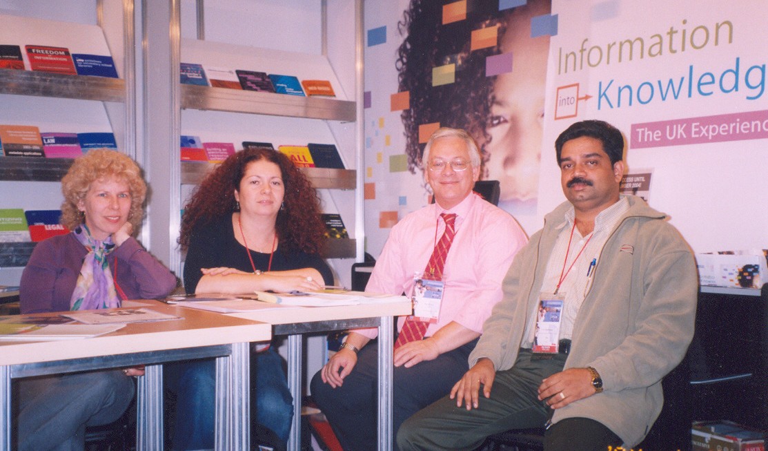 J K Vijayakumar with Mr Bob McKee', the Chief Executive and other staff from The Chartered Institute of Library and Information Professionals at CILIP stand during IFLA General Conference 2004 held in Buenos Aires, Argentina during August 2004 |