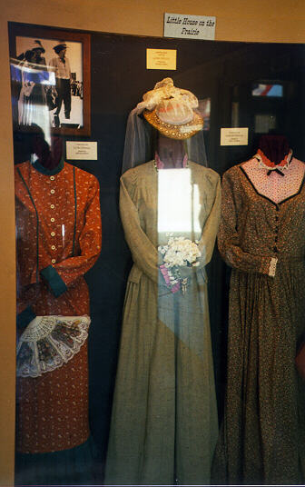 I didn't know that Little House of the Prairie was filmed here too. Here's a picture of some of the costumes for Laura. (The glare is from the front door of the building -- Sorry!)