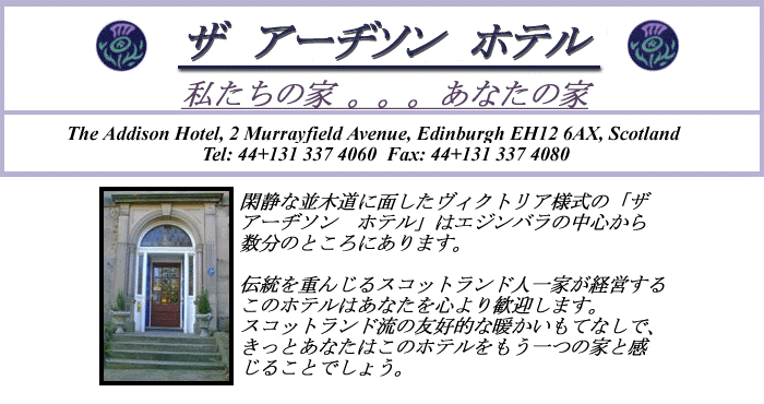 エジンバラには、アヂソン ホテル があります。アヂソン ホテルは エジンバラの 中心に 位置 しています がとても静かです。 私たち アヂソン ホテル の スタッフ は、あなたの友達になりたい。 あなたには 心から 扉を 開きます。 スコットランドは心暖かいひとがたくさんいます。スコットランドを代表する街、エジンバラにも 心暖かいひとがたくさんいます。 アヂソン ホテル のスタッフも とても 暖かい 人々です。 アヂソン ホテル は家族的なおもてなしをします。 おいしい食事とふかふかのベッド での おもてなしです。B&Bもできます。安い。