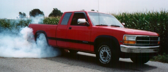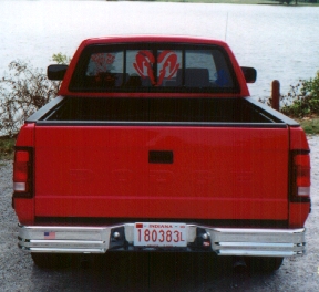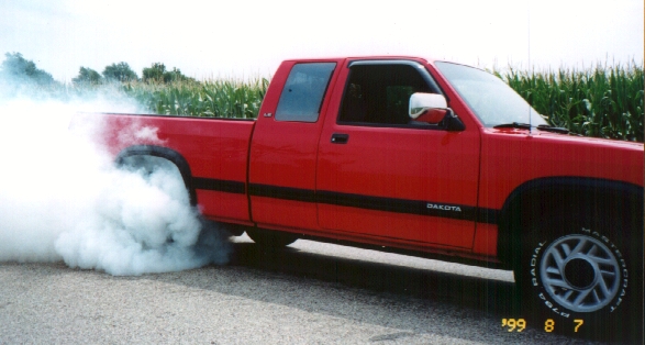 This is my truck. Its a stock 1993 Dodge Dakota. It has tinted windows, a complete stereo system, plus stickers on the back window that states "BITE ME CHEVY BOY!!", a Dodge Ram Head, a blue Great Milenko head. Just click on the thumbnails below to see enlarged images of the truck.