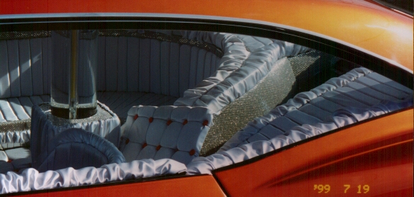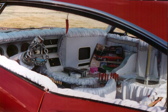 Interior mods- Sectional couch, swivel bucket, bubble tube w/neon accents, Wet bar w/ refrigerator, tequila bottle shifter&turn signal levers, 8" chrome chain steering wheel(FAT 8)&complete interior stiched in white windsor satin including the floor. Trunk area trimmed in sequins and orange.