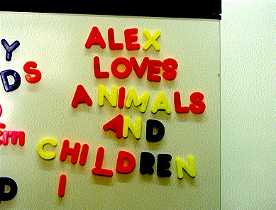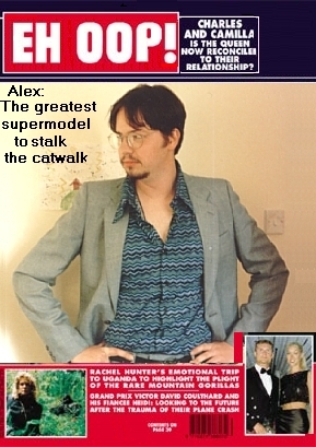 13/10/2000 Alex's image is taking a beating: covert photography has not only shown him dancing and singing with small children, but also that he has professed his love for them in literature, through the medium of fridge magnets. In other news, the duo were seen out and about by members of the Dork public last night, consuming vast quantities of food and drink in a humble tavern. Alex may well be joined by one of his cronies today for a state visit.