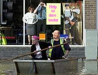 3/11/2000Floods sweep Dorkshire affecting everyone including the leadership. Alex 's day is ruined by the premature death of Dorks down t'pit, Graham begins a mass gender debate, and all the time the water creeps higher. Dorkshire is in danger of total submergence, and alex's palace is under water. This picture shows the evacuation, similar to that at Saigon only by water rather than air, as Alex is forces an old lady to row him away from the danger. He leaves behind many helpless Dork slaves to face the rising waters alone and with no aid. Alex says that if they survive they are welcome to resume a life of unpaid drudgery. In the melee, Graham's skateboard (top right) was forgotten which may lead to some rows between the leadership. In other news, Kofi Annan unveils his official UN website we will bring you up to date with this once we know more.