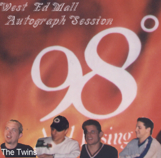 Hey!! We went to a 98 degrees autograph session in west edmonton mall and it was sooo awesome!! We waited for like 3 hours but it was worth it!! We can't believe how nice and fine those guys are! They all shook our hands and said something...like how are you? or thanks so much for coming!! It was great! Here are some pix we blew up so you can see them better! In actual life they are really crappy but computers just seem to do wonders! Here they are: