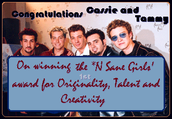 This is our first award. It's for originality and stuff. We think that kicks ass and are very thankful. Especially since we try so hard to be original. Thanks to the girls at "*NSANELY *NSYNC" for this honor. To all the webmasters out there, you too can get this award through originality. Yay! And I'm sure there will be many more awards after this. It's all up to you guys out there to nominate us and vote.