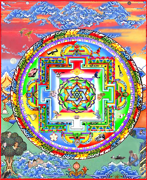 Erik’s essence is honored by moving his color (aquamarine) to the center. In Buddhist mythology, the continents float on the ocean. Or, more accurately, they rest on the back of a giant fish, which is the first incarnation of Vishnu, and the fish swims in the primordial ocean. This mandala is built on a blue foundation. The quadrants of the mandala-palace are divided into isosceles triangles of color, : white, yellow, red, green and blue. Each of these colors is associated with the five wisdoms of human nature. Specifically: White - Vairocana: The wisdom of reality tempers the delusion of ignorance. Yellow - Ratnasambhava: The wisdom of sameness overcomes the delusion of pride. Red - Amitabha: The wisdom of discernment releases the delusion of attachment. Green - Amoghasiddhi: The wisdom of fulfillment dispels the delusion of jealousy. Blue - Akshobhya: The mirror overcomes the delusion of anger.