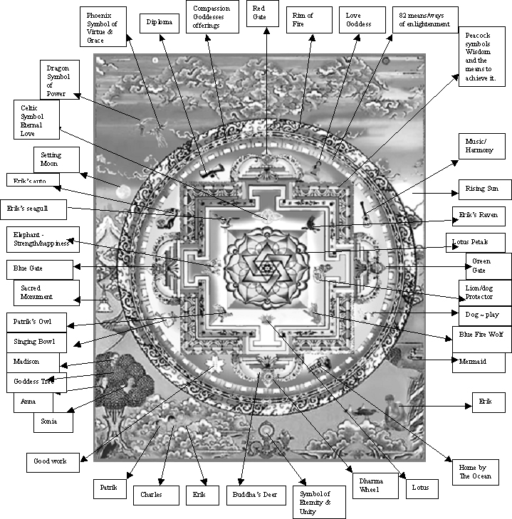 The primary deity of each mandala is represented at the very center, (the throne within the palace). At the center of this mandala is Erik’s aquamarine in the protective star of David surrounded by the wisdom of the open lotus.