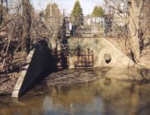 | Right: It didn't work! This combined sewer outfall just downstream of Auburn's Eckhart Park was built in 1968. In heavy rain the hatches were supposed to open to discharge "safely diluted" raw sewage. But the designers forgot that rain makes the creek rise, equalizing pressure on both sides of the hatches. The hatches stayed shut, sending a torrent of storm water rushing through the sewage treatment plant. Photo by Mike Walter. | ![]() |