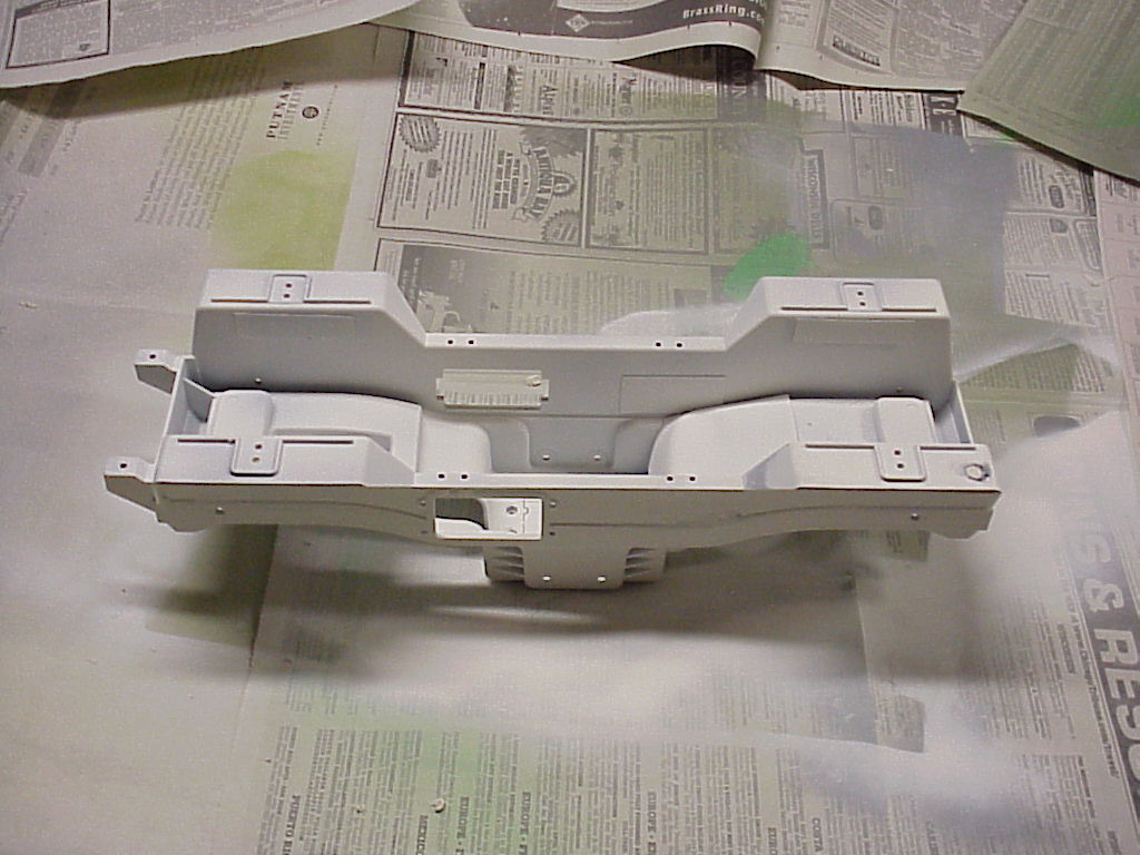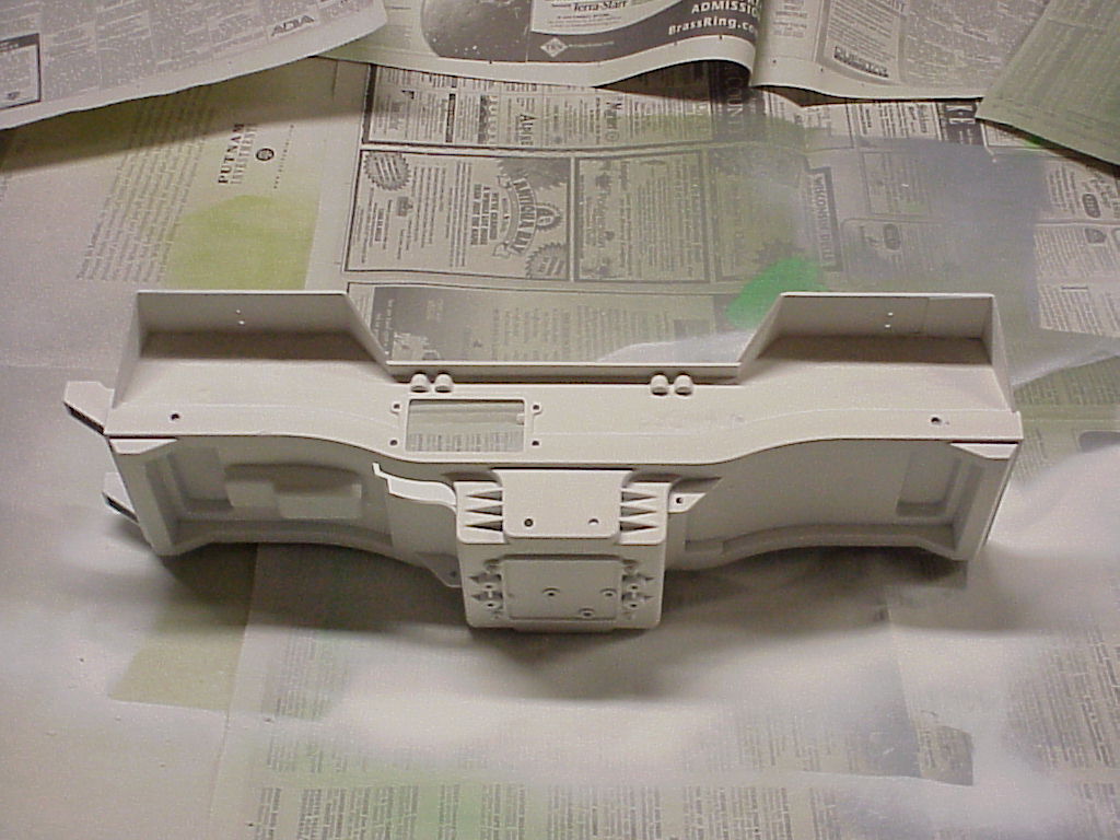 This page will show how I built my Clodbuster capable of driving in deep snow the stock chassis will be used. As you can see by the first picture the rear steering hole has been filled from the inside with a piece of a milk jug and from the outside with modelers putty. You can also see that all of the stock shock holes have been ground off and filled in and new shock holes have been drilled in a lower location. Both of the switch holes have also been filled in with a scrap piece of lexan and modelers putty. Pictured below is one of the rods I plan to use for suspension arms. It is a piece of 4-40 threaded rod and 4-40 ends, the rod is then covered with a piece of 5/32" aluminum tubing. Below you can also see the custom chassis brace I made for it. This helps to lower the links and keep the suspension geometry the same. After testing the brace will not be used. All of the mounting holes on the chassis have been filled with a black silicone from Permatex. The truck will retain the stock body and mounts. the stock radio tray will be used with some minor modifications. A few of the pictures will demonstrate the height differences between this Clod and a Clodzilla IV. A 27 turn stock motor with 5 degrees of advanced timing will be used in each gearbox. These will be wired in parallel to increase speed. A Novak Super Rooster electronic speed controller will also be used to handle these motors and a 7 cell battery pack. An external cooling fan will be used on this speed controller. For steering a single Hitec 615mg servo will be used and mounted in the stock location. Click here to learn how to paint a body like this. This project has been completed and runs perfectly.