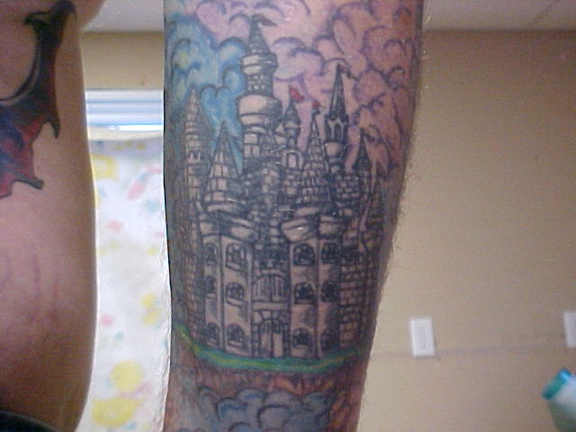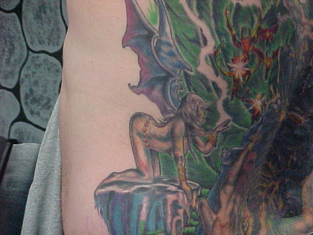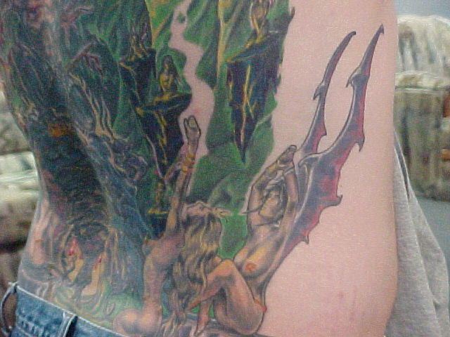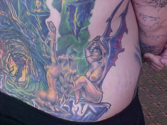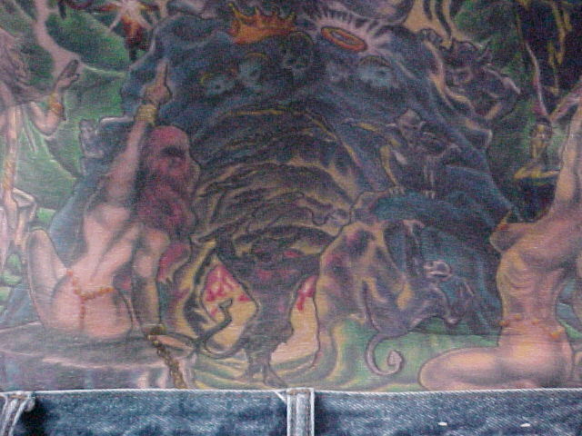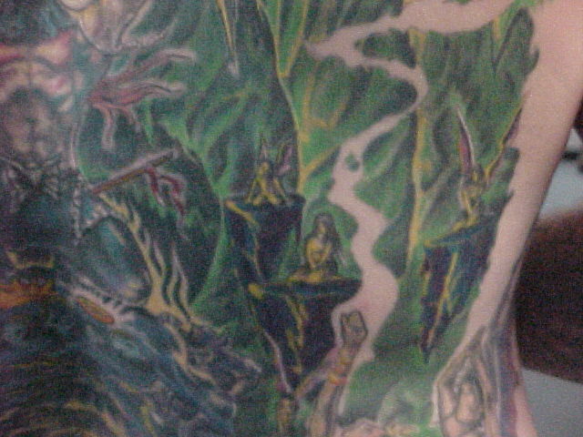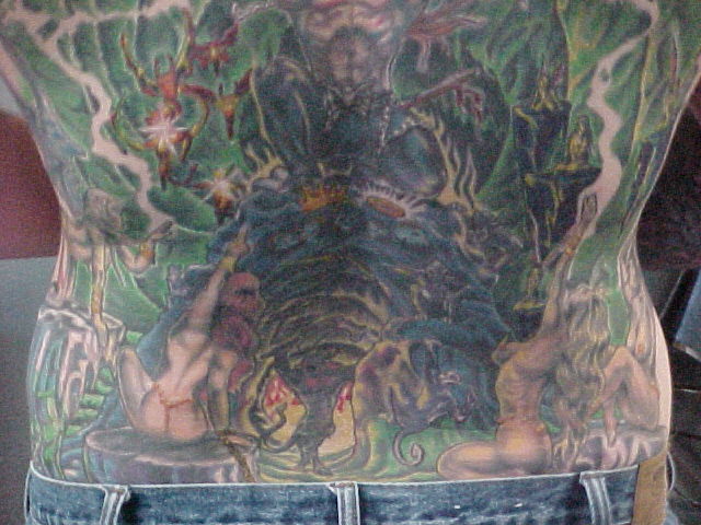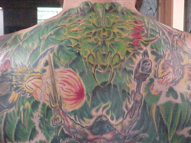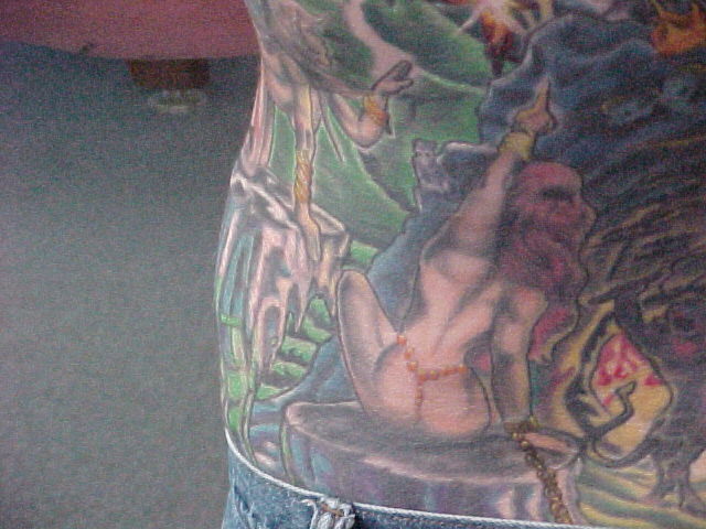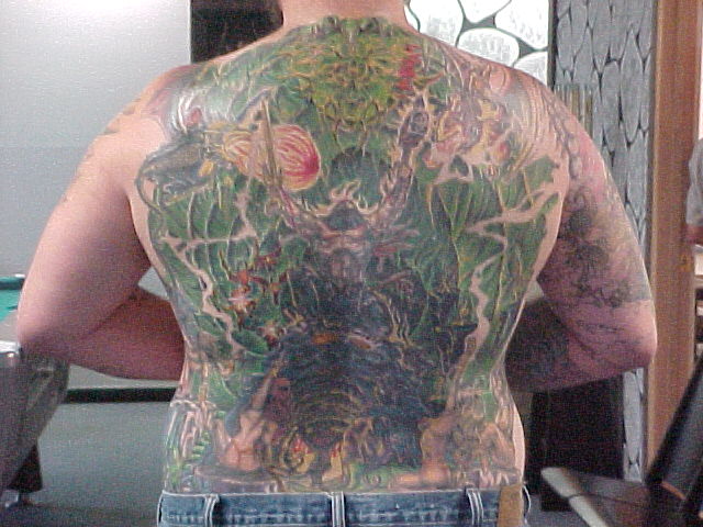 My back I have 51 hours in it with the first artist. The one that I was going to always had excuses there toward the end for only wanting to work on it for a little while and cut the sessions short. Also, he said that he thought that the piece was complete in which part of it was but, alot wasn't and he put a marijuana leaf in it and thought that it was funny! This was one of the first things that i had taken care of by doing a coverup over it.