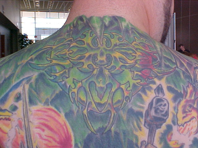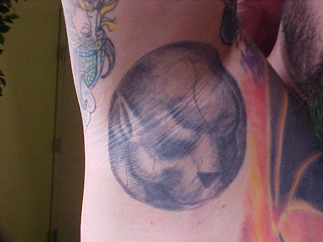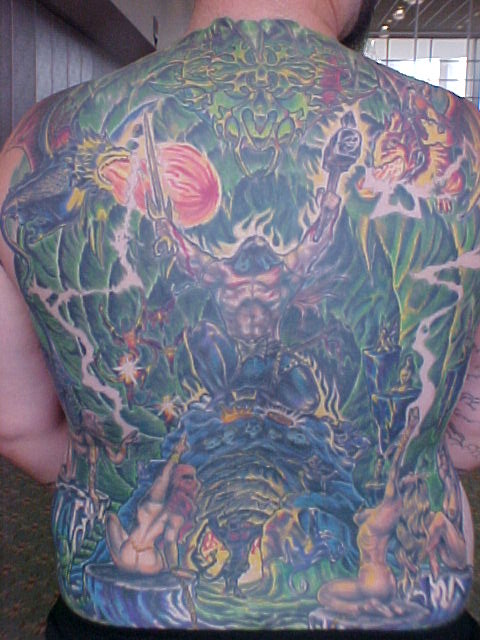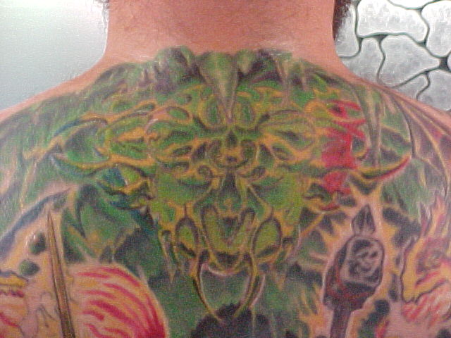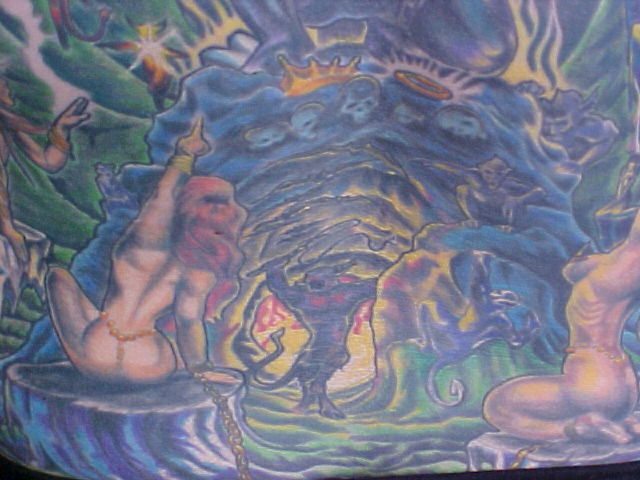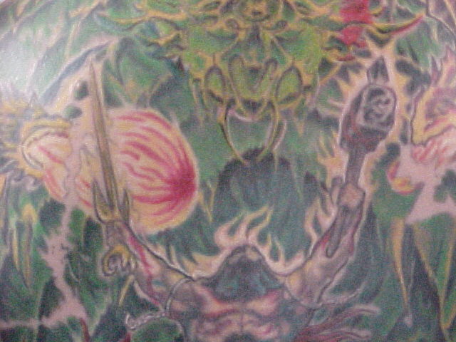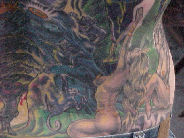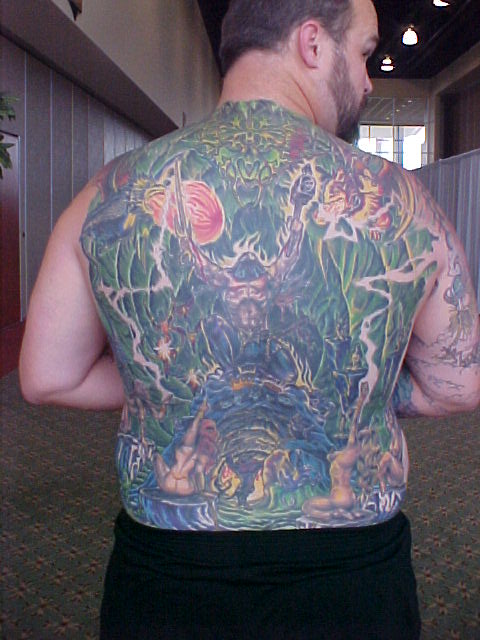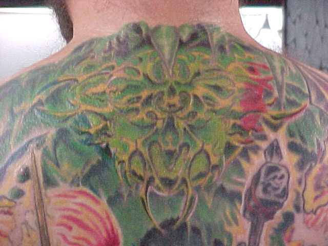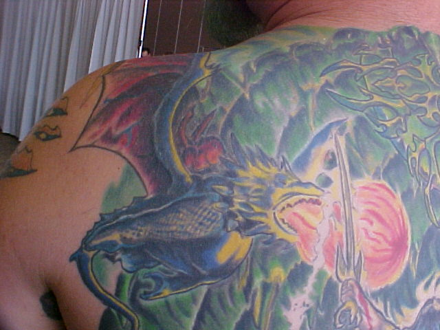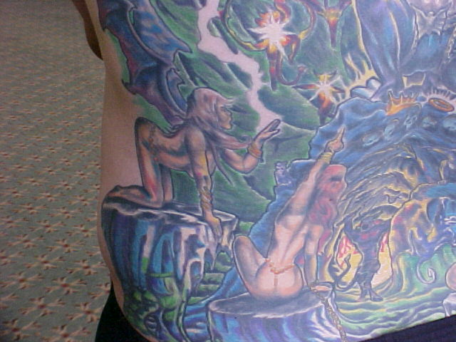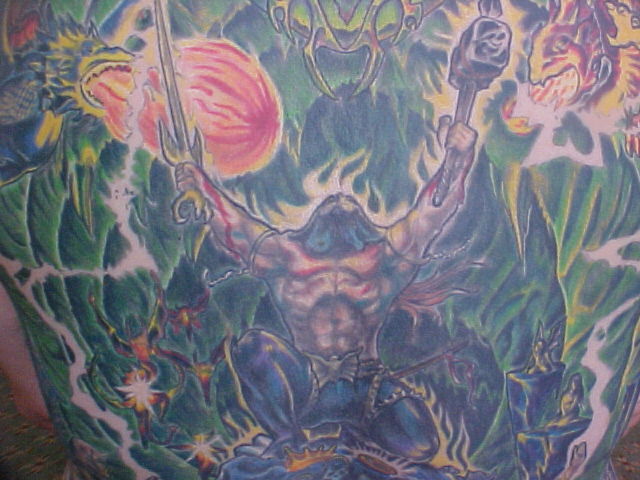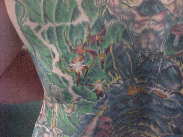 I just started going to another artist and have 8 hours in my back with him so far. He has some great ideas onto how to make it stand out better and other color contrast. He made the sphere at the top look more real and alot more like reflective chrome. He also has given everything faces that didn't have none. Since Russell, started on it and been adding to my back I've got alot more complements and have also won 3 trophies!!